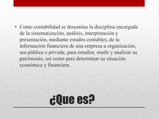 La contabilidad es la disciplina encargada de sistematizar, analizar e interpretar la información financiera de una empresa u organización para determinar su situación económica y financiera. Sus objetivos principales son obtener información ordenada sobre el movimiento económico y financiero, establecer la cuantía de los bienes, deudas y patrimonio, y proporcionar una imagen clara de la situación financiera. La contabilidad es importante para administrar el dinero de manera efectiva y cumplir con los requisitos tributarios. Existen dos tipos principales: la