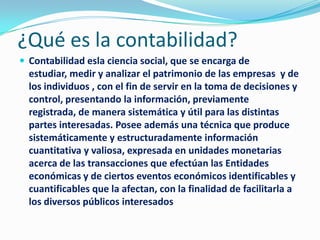 La contabilidad es la ciencia que estudia y analiza el patrimonio de las empresas y personas para ayudar en la toma de decisiones. Se compone de un plan de cuentas que clasifica las cuentas, un diario general donde se registran las transacciones, y la mayorización y balances que suman los valores para reportar la situación financiera.