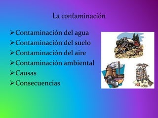 La contaminación puede ser del agua, suelo, aire o ambiental. Se produce principalmente por descargas industriales y domésticas, derrames de petróleo, quema de basura y emisiones de vehículos. Sus consecuencias incluyen enfermedades, muerte de organismos, erosión del suelo y calentamiento global. Debemos tomar conciencia del daño que causamos al planeta y reducir la contaminación.