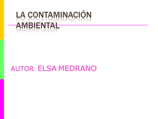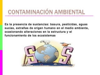 El documento describe los tipos y causas de la contaminación ambiental, incluyendo la contaminación del agua, suelo y aire. Las causas principales son los desechos sólidos domésticos e industriales, el exceso de fertilizantes y productos químicos, la tala y quema de basura, los gases de los vehículos y el vertido de aguas negras. La contaminación daña los ecosistemas y perjudica la salud de las personas y otros seres vivos.