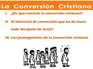 El documento describe las tres etapas del proceso de conversión cristiana: 1) un encuentro personal con Jesús resucitado, 2) optar decididamente por seguir a Jesús, y 3) anunciar activamente la Buena Nueva de Jesús. Explica que la conversión implica un cambio de vida orientado hacia Dios y siguiendo el ejemplo de Jesús. También identifica a Dios, el Espíritu Santo y las personas como protagonistas clave de la conversión.