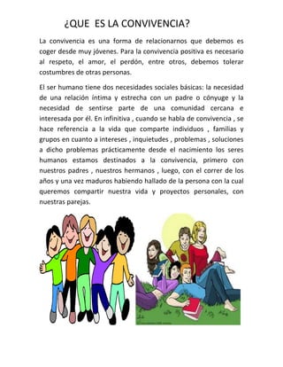 La convivencia se refiere a la forma en que las personas se relacionan y viven juntas, lo cual requiere respeto, amor, perdón y tolerancia hacia las costumbres de los demás. La convivencia satisface las necesidades humanas básicas de intimidad con la familia y de pertenencia a una comunidad, ya que desde el nacimiento estamos destinados a convivir primero con la familia y luego con la pareja para compartir intereses, problemas y soluciones.