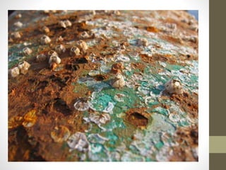 La corrosión es la oxidación de materiales metálicos que causa su deterioro. Existen varios tipos de corrosión, incluyendo la atmosférica, la cual causa más daños, y la galvánica, que ocurre cuando metales diferentes interactúan. Para prevenir la corrosión se pueden usar métodos como recubrimientos protectores, pinturas especiales o protección catódica.