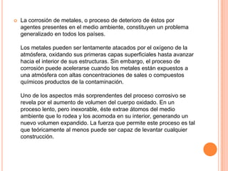 La corrosión es el deterioro de metales debido a agentes en el medio ambiente. Puede acelerarse por sales u otros químicos contaminantes. Un aspecto sorprendente es que la corrosión hace que el metal ocupe más volumen, lo que teóricamente podría levantar cualquier construcción. La corrosión daña monumentos, puentes y otras estructuras en muchos países.