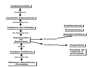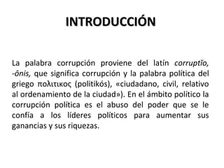 Este documento define la corrupción política como el mal uso del poder gubernamental para obtener ventajas y beneficios ilegítimos. Explica que la corrupción tiene un impacto negativo en la administración pública, la sociedad y la economía. También menciona algunas formas comunes de corrupción política como sobornos e influencias, y que organismos como la controlaría general, la corte suprema de justicia y Transparencia Internacional luchan contra la corrupción.