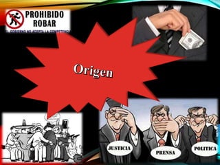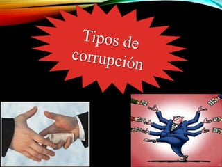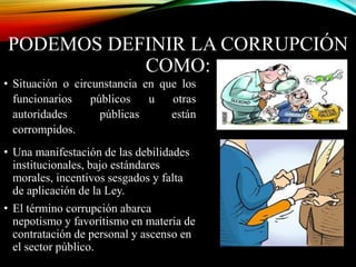 El documento define la corrupción como situaciones en que funcionarios públicos actúan de manera corrupta, lo que demuestra debilidades institucionales y falta de aplicación de la ley. La corrupción incluye nepotismo y favoritismo en contrataciones. Las causas incluyen sueldos bajos que obligan a funcionarios a buscar otros ingresos, poca fiscalización de las autoridades y falta de participación ciudadana. Las consecuencias son que puede perjudicar las instituciones públicas, eliminar leyes útiles y atraer menos inversiones.
