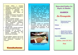 La corrupción consiste en acuerdos inmorales entre corruptores y corruptos que benefician intereses particulares por encima del bien común. Existen varias formas de corrupción como exigir o aceptar dinero a cambio de favores, conceder cargos no por mérito sino por compadrazgo, o tomar decisiones por favoritismo en lugar de mérito. La corrupción perjudica el ejercicio del poder político y la capacidad del Estado de lograr sus fines para el bienestar de la sociedad.
