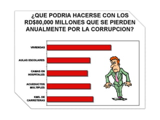 La corrupción ocurre cuando una persona abusa de su poder para obtener un beneficio para sí mismo, sus familiares o amigos. La corrupción en el Perú tiene efectos económicos como desincentivar la inversión, efectos sociales como aumentar las diferencias sociales, y efectos políticos como perjudicar el funcionamiento de las instituciones públicas. Combatir la corrupción requiere esfuerzos de todos los peruanos.