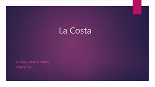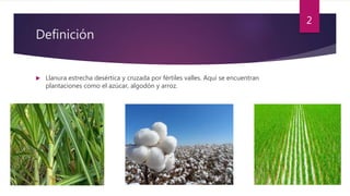 La costa peruana es una estrecha llanura desértica entre los Andes y el océano Pacífico que alberga el 10% de la superficie del Perú. Presenta valles fértiles para cultivos como el azúcar, algodón y arroz, donde vive más de la mitad de la población peruana. El clima varía de abundantes lluvias y vegetación en el norte a escasa lluvia y vegetación en el centro y sur.