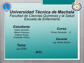 Este documento presenta información sobre la CPU (unidad central de procesamiento), incluyendo su función como el componente principal que procesa datos e instrucciones de programas, y cómo ha evolucionado de placas de circuitos grandes a chips diminutos. También describe conceptos clave como la velocidad de la CPU medida en megahertz y gigahertz, y las unidades lógicas que componen la CPU como la unidad aritmético lógica y la unidad de control.