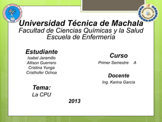 Este documento presenta información sobre la CPU (unidad central de procesamiento), incluyendo su función como el componente principal que procesa datos y ejecuta instrucciones en una computadora, y cómo ha evolucionado de placas de circuitos grandes a chips diminutos. También describe conceptos clave como la velocidad de la CPU medida en megahertz y gigahertz, y sus unidades internas como la unidad aritmético lógica y la unidad de control.