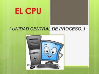 Este documento presenta información sobre la CPU (unidad central de procesamiento), incluyendo su función como el componente principal que procesa datos y ejecuta instrucciones en una computadora, y cómo ha evolucionado de placas de circuitos grandes a chips diminutos. También describe conceptos clave como la velocidad de la CPU medida en megahertz y gigahertz, y sus dos unidades principales: la unidad aritmético lógica y la unidad de control.