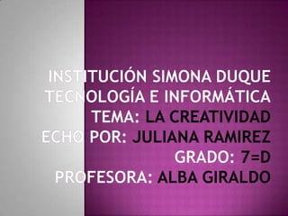 El documento habla sobre el razonamiento y la creatividad. El razonamiento es la capacidad de resolver problemas lógicos deduciendo las circunstancias, y es una de las formas primarias de inteligencia. La creatividad es la capacidad del cerebro para crear cosas nuevas de manera intencional para alcanzar un objetivo, y se manifiesta a través de formas artísticas, científicas y literarias.