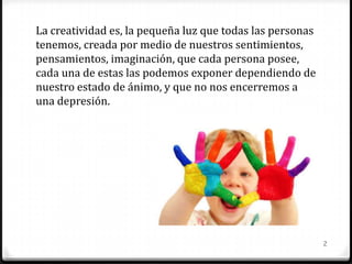La creatividad es una capacidad inherente a todas las personas que se manifiesta a través de los sentimientos, pensamientos e imaginación. Las personas creativas suelen tener características como la confianza en sí mismas, flexibilidad, imaginación y curiosidad. Los bloqueos a la creatividad pueden ser de tipo emocional, perceptivo o cultural y se proponen técnicas como la lluvia de ideas para fomentar la creatividad en grupo de manera desinhibida.