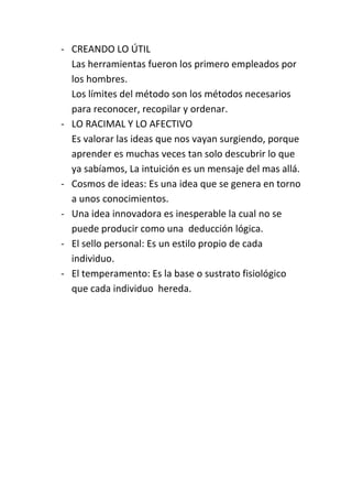 El documento habla sobre la creatividad humana y sus motivaciones. Discute que el hombre es creativo por naturaleza debido a que posee racionalidad y afectividad. También menciona que el estímulo hedonista impulsa la creatividad del hombre en su afán de superación. Finalmente, señala que la intuición es un mensaje del más allá y que cada persona tiene un sello y temperamento personal que influye en su creatividad.