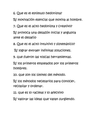 El documento discute la naturaleza de la creatividad humana. Explica que los seres humanos tienen la capacidad única de crear cosas de la nada debido a que poseen tanto racionalidad como afectividad. También explora conceptos como el hábitat humano, los estímulos hedonistas, los actos intuitivos y sistemáticos, los límites de los métodos, lo racional frente a lo afectivo, la intuición, el análisis analítico y las ideas innovadoras.