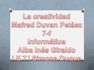 Este documento describe la creatividad como la capacidad de ver más allá de lo evidente y generar nuevas ideas y soluciones originales mediante el pensamiento divergente. Define la creatividad como la capacidad de crear cosas nuevas y valiosas de manera intencionada, la cual puede adoptar formas artísticas, literarias o científicas. Además, señala que el furor de la inspiración no es útil para la creatividad.