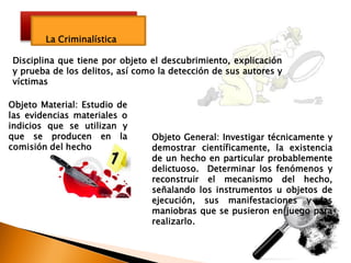 Este documento describe la ciencia de la criminalística. Explica que la criminalística tiene como objetivo descubrir, explicar y probar delitos para detectar a sus autores y víctimas. Se divide en criminalística de campo, que recopila evidencia en la escena del crimen, y criminalística de laboratorio, que analiza evidencia. También describe principios científicos como el intercambio de evidencia y la reconstrucción de eventos, y formas de conocimiento como el método científico y el empírico.