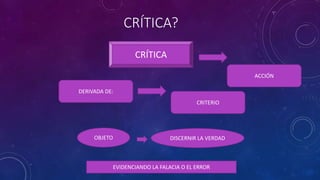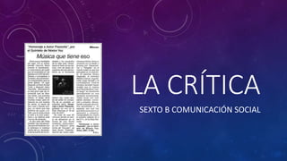 Este documento define la crítica periodística y describe sus características. Consiste en el análisis y comentario de diferentes temas basado en datos y argumentos sólidos. Tiene tres funciones: interpretación, juicio y orientación. Se presenta como un género de opinión fundamentado que profundiza sobre la información para relacionarla con su contexto y explicarla.