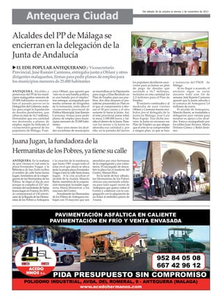 Los alcaldes del PP de Málaga en municipios menores de 25,000 habitantes se encierran en la delegación de la Junta para exigir el pago de deuda de 16,7 millones de euros, incluyendo 2,5 millones para planes de empleo. Antequera presentará un presupuesto de 34,28 millones para 2014, el más social de su historia, con un aumento del 5% respecto al año anterior. También se discute el realojo de 9 familias en viviendas nuevas y la bonificación de impuestos a empresas para fomentar la creación de empleo.