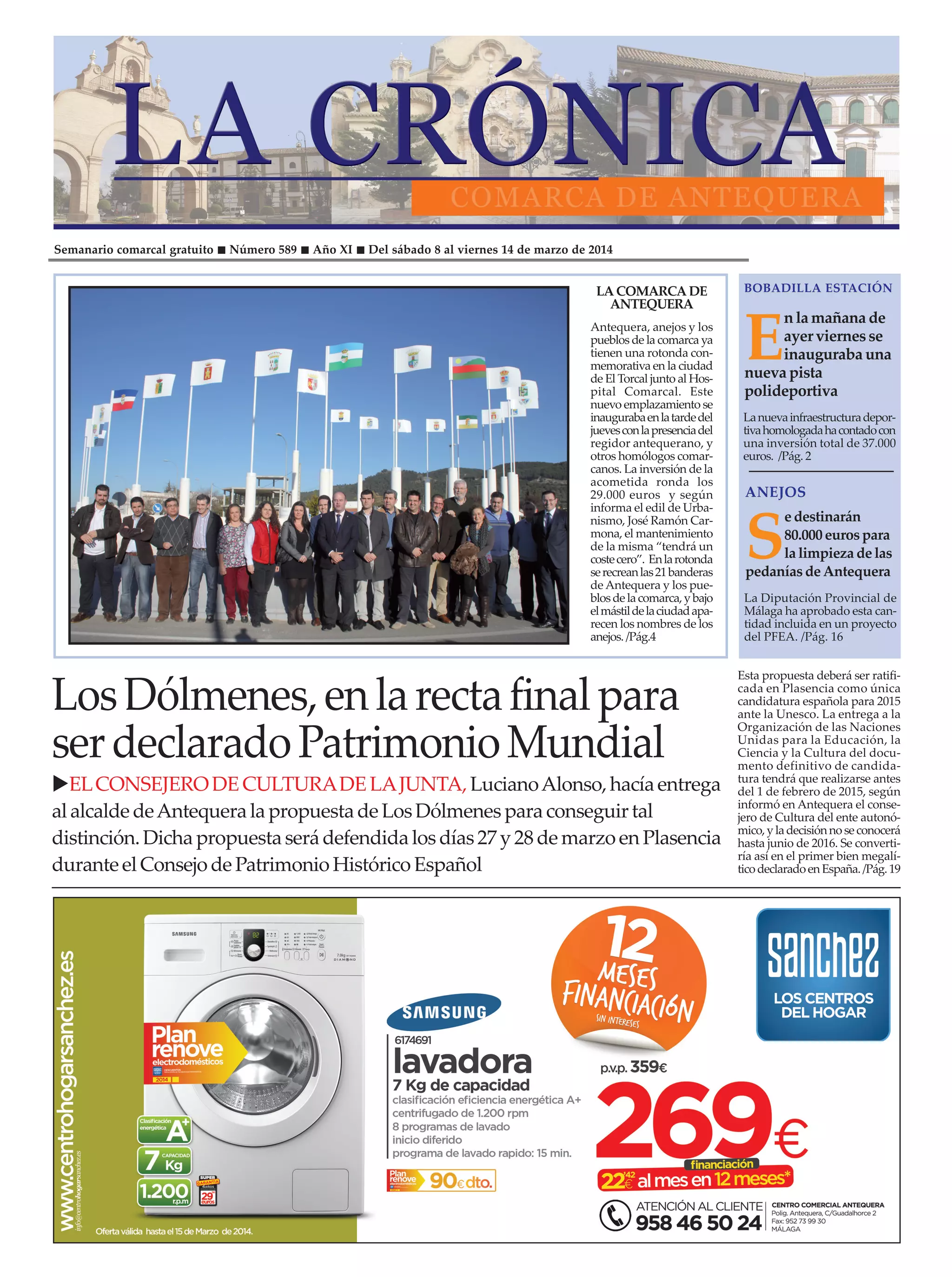 La comarca de Antequera inaugura una nueva rotonda junto al hospital, con una inversión de 29,000 euros y un mantenimiento a coste cero, que rinde homenaje a los 21 pueblos de la comarca. Además, se destaca la propuesta para que los dólmenes de Antequera sean declarados patrimonio mundial, con la defensa de la candidatura programada para finales de marzo de 2014. También se ha inaugurado una nueva pista polideportiva en Bobadilla Estación, con una inversión de 37,000 euros, que será utilizada por el centro educativo local y la comunidad.