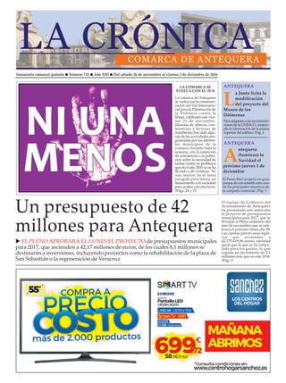 El ayuntamiento de Antequera ha presentado un presupuesto municipal para 2017 de 42,17 millones de euros, con 8,1 millones destinados a inversiones en proyectos como la rehabilitación de la plaza de San Sebastián. Además, se conmemora el Día Internacional para la Eliminación de la Violencia contra la Mujer con actividades en la comarca. También se planea la modificación del proyecto del museo de los dólmenes para cumplir con recomendaciones de la UNESCO.