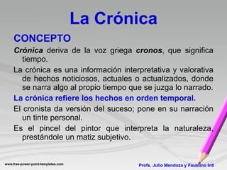 Este documento define la crónica como un relato periodístico que interpreta y evalúa hechos actuales de manera subjetiva, narrándolos en orden temporal. Explica que existen diferentes tipos de crónicas como informativas, opinativas, interpretativas y más. Además, detalla la estructura básica de una crónica, que incluye una introducción, el cuerpo narrando los hechos de forma cronológica, y una conclusión. Por último, enfatiza la importancia de escribir de manera clara, concisa y