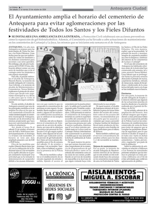 La Junta de Andalucía ha comenzado la ampliación de los centros de salud de Mollina y Campillos con una inversión de 390.000 euros para mejorar la atención sanitaria en respuesta al COVID-19. Asimismo, se han implementado medidas sanitarias especiales para las celebraciones del Día de Todos los Santos en el cementerio municipal de Antequera, incluyendo la ampliación de horarios y servicios de ambulancia. Además, se ha inaugurado una exposición del artista Andrés Mérida, que muestra 42 obras representativas de su evolución artística a lo largo de la última década.