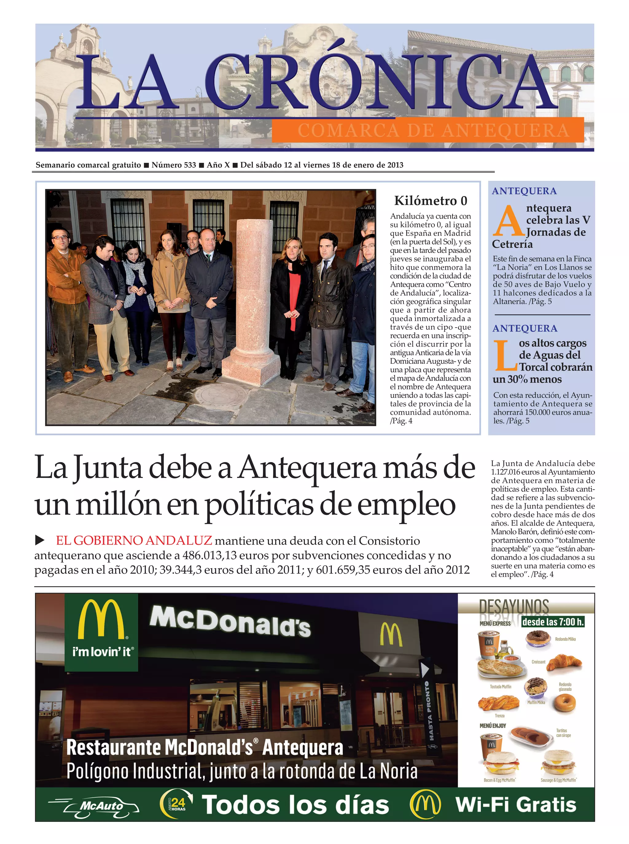 El semanario destaca la inauguración del 'kilómetro 0' de Antequera y la conmemoración de su condición de centro de Andalucía. Además, se menciona la deuda de la Junta de Andalucía con el ayuntamiento en políticas de empleo, que asciende a más de 1 millón de euros, y los desafíos económicos que enfrentan los comerciantes durante el periodo de rebajas. Finalmente, se informan sobre las jornadas de cetrería que incluyen actividades culturales y la participación de escolares en exhibiciones.