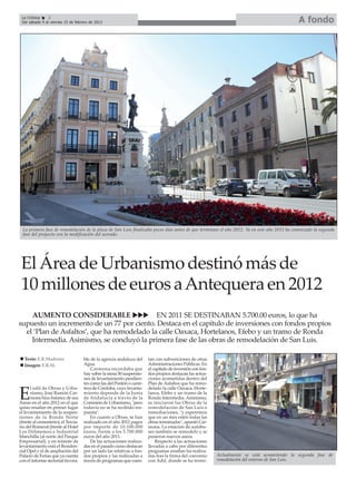 El documento presenta la inauguración del Centro de Protección para Menores "La Retama" en Antequera, con capacidad para 12 plazas. También destaca que el Área de Urbanismo del Ayuntamiento destinó más de 10 millones de euros a inversiones en la ciudad en 2012, un aumento del 77% respecto al año anterior. Además, en 2012 se llevó a cabo una nueva revisión catastral que no se hacía desde el año 2000.