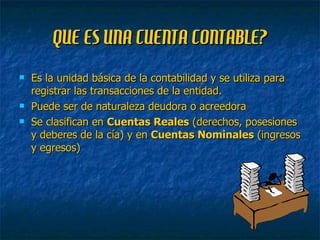 Una cuenta contable es la unidad básica para registrar transacciones y puede ser deudora o acreedora. Existen cuentas reales que muestran la situación financiera en un balance general e incluyen activo, pasivo y patrimonio, y cuentas nominales que indican ingresos y egresos en un estado de ganancias y pérdidas. Cada cuenta tiene una sección debe y haber, y el saldo resulta de restar debe menos haber.