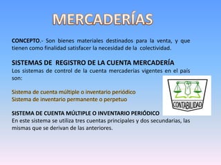 Este documento describe el sistema de cuenta múltiple o inventario periódico para controlar las existencias de mercaderías en una empresa. Este sistema utiliza tres cuentas principales (Mercaderías, Compras, Ventas) y dos secundarias (Devolución en Compras, Devolución en Ventas). Al final de cada período, se realiza un inventario físico y contable para determinar el costo de ventas y la utilidad bruta. Existen diferentes métodos como FIFO, LIFO y promedio para valuar las existencias.