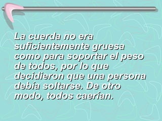 Once personas se aferraban a una cuerda de helicóptero que no era lo suficientemente gruesa para soportarlos a todos, por lo que una persona debía soltarse para que los demás no cayeran. La única mujer del grupo se ofreció voluntariamente a soltarse, diciendo que como madre, esposa, hija y profesional siempre anteponía los intereses de los demás a los propios. Los hombres aplaudieron emocionados pero terminaron cayéndose todos porque se distrajeron.