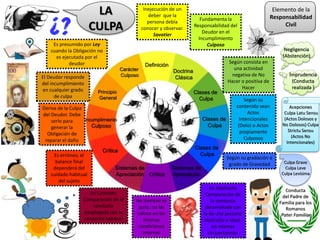 Este documento presenta un resumen de la culpa como elemento de la responsabilidad civil. Define la culpa como la inejecución de un deber que la persona debía conocer y observar. Explica que existen diferentes clases de culpa según si consiste en una actividad negativa de no hacer o positiva de hacer, y según su contenido sea intencional o culposo. También distingue entre los sistemas de apreciación de la culpa en abstracto o en concreto.