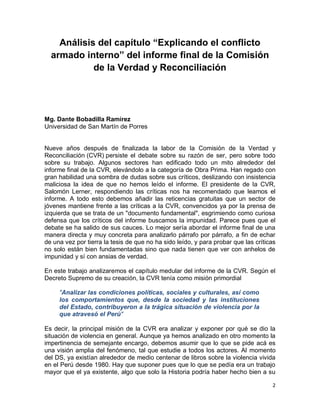 El documento resume y critica el capítulo "Explicando el conflicto armado interno" del informe final de la Comisión de la Verdad y Reconciliación del Perú. Señala que el capítulo usa un lenguaje sesgado al referirse a las acciones de Sendero Luminoso como un "conflicto armado" en vez de actos terroristas. También muestra un enfoque marxista al analizar las causas de la violencia e interpretar los "anhelos de transformación profunda de la sociedad" del pueblo peruano. Finalmente, crit