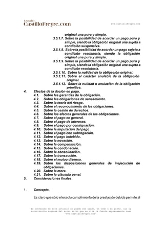 Este documento discute la naturaleza jurídica de la dación en pago. Define la dación en pago como un medio extintivo de obligaciones en el que el deudor cumple con una prestación distinta a la originalmente acordada, con el consentimiento del acreedor. Argumenta que la dación en pago implica una novación objetiva, pues requiere extinguir primero la obligación original y crear una nueva obligación para cumplir con la prestación alternativa. Explora diversas posiciones doctrinales sobre este tema y sus efectos legales.