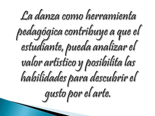 La danza es una forma de arte que utiliza el movimiento del cuerpo, usualmente con música, como una forma de expresión, interacción social o propósitos religiosos o de entretenimiento. La danza se compone de elementos básicos como el movimiento, ritmo y expresión corporal que se interrelacionan para transmitir emociones al bailarín y público. A lo largo de la historia, la danza se ha vinculado tradicionalmente a la educación física y artística.