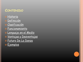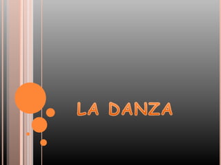 La danza ha formado parte de la humanidad desde hace más de 10,000 años y se ha utilizado para rituales religiosos y de caza. A través de la historia, la danza se desarrolló en Egipto, Grecia y Roma antes de diversificarse en estilos como el ballet y la danza moderna. La danza se puede clasificar de diferentes maneras y sirve para comunicar sentimientos y emociones a través del lenguaje corporal.