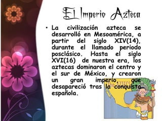 El Imperio Azteca dominó el centro y sur de México desde el siglo XIV hasta el siglo XVI. Sin embargo, la civilización azteca comenzó a declinar tras la llegada de los españoles en 1519 liderados por Hernán Cortés. Cortés se alió con otros pueblos nativos enemigos de los aztecas para derrotarlos. Tras capturar y matar al emperador azteca Moctezuma Xocoyotzín, los españoles impusieron el catolicismo y diezmaron la población azteca con en