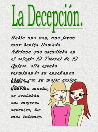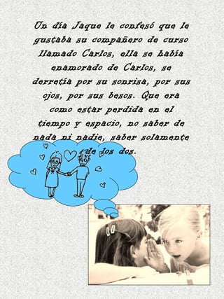 Jaque se enamoró de su compañero Carlos y se le declaró, pero él la rechazó y dijo que solo quería ser su amigo. Después Jaque los encontró juntos a él y a su mejor amiga Adriana, lo que la hizo sufrir mucho. A causa del dolor, Jaque se suicidó intoxicándose con pastillas. Cuando Adriana se enteró, se sintió arrepentida por haberle quitado a su amor y nunca más quiso ver a Carlos.