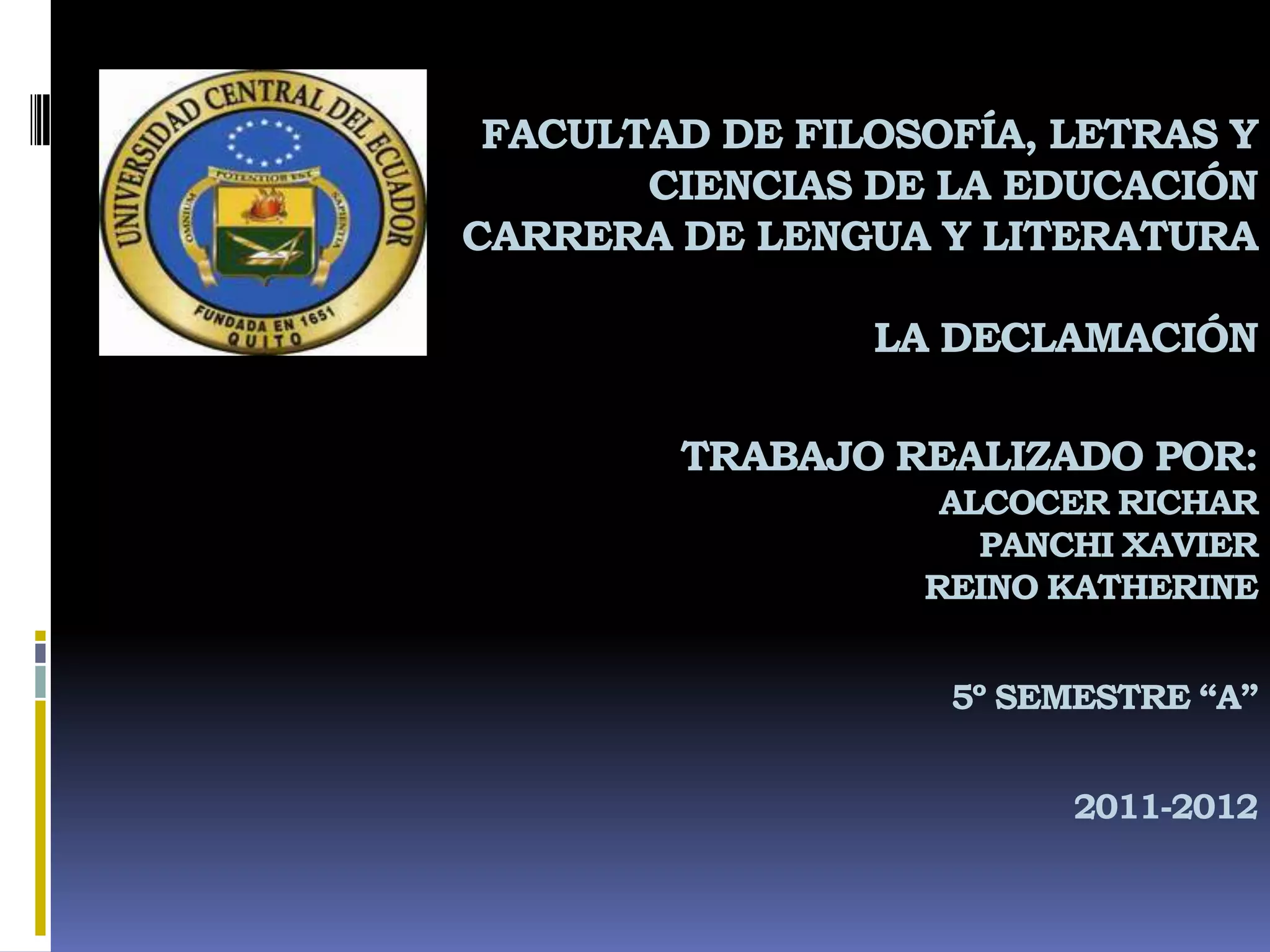 Este documento describe la declamación como el arte de transmitir los sentimientos de un poema a través de la palabra hablada de forma natural y fiel. Explica que la declamación busca cristalizar el propósito del poema y obsesionar por la belleza de la voz, la acción y el gesto. Además, detalla 15 pasos para declamar correctamente y diferenciar entre lo bello y lo bueno. Finalmente, incluye dos enlaces sobre la declamación.