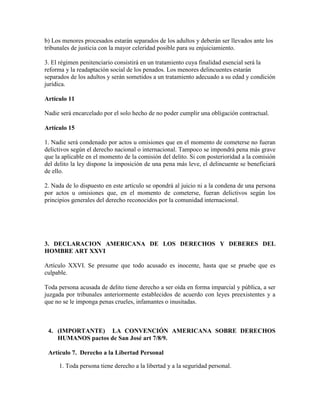 Estos documentos establecen estándares internacionales para los derechos de las personas acusadas de delitos y detenidas. Todos garantizan el derecho a un juicio justo, incluida la presunción de inocencia, el derecho a un abogado y a no autoincriminarse. También prohíben la detención arbitraria, la tortura y otros tratos crueles, y exigen que los detenidos sean tratados de forma humana y juzgados dentro de un plazo razonable.
