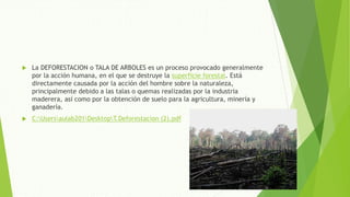 La deforestación está causando la pérdida de grandes extensiones de bosques y selvas en todo el mundo. La tala de árboles con fines agrícolas, ganaderos e industriales es la principal causa de deforestación, aunque también contribuyen el comercio de madera y la expansión urbana. Esto tiene graves consecuencias ambientales como la pérdida de hábitat y la alteración del clima. Las soluciones viables incluyen regular la tala de árboles y aumentar las reforestaciones para reemplazar los árboles talados.