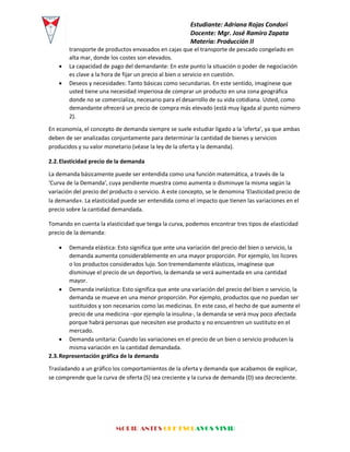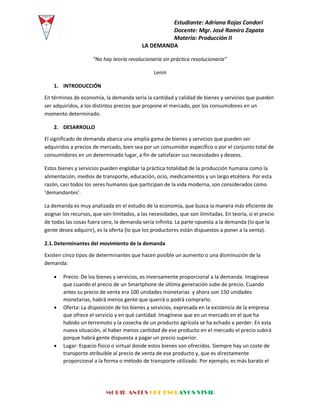 La demanda se refiere a la cantidad total de un bien o servicio que las personas desean adquirir a un precio determinado. La demanda depende de factores como el precio, la oferta, la capacidad de pago de los consumidores, y sus deseos y necesidades. Existen curvas de demanda que muestran gráficamente cómo varía la cantidad demandada con respecto al precio. La elasticidad precio de la demanda indica el grado en el que la demanda cambia ante variaciones en el precio.