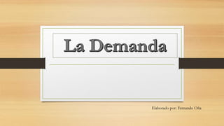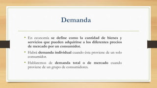 La demanda se refiere a la cantidad de bienes y servicios que los consumidores están dispuestos y son capaces de comprar a diferentes precios. Existe una relación inversa entre el precio y la cantidad demandada, conocida como la ley de la demanda. La demanda puede ser individual o del mercado y depende de factores como la población, los ingresos, los gustos, y los precios de bienes sustitutos y complementarios. Una curva de demanda muestra la relación entre cantidad y precio, y puede desplazarse si cambian factores como los ingres