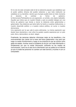 La democracia se define como el derecho de un pueblo a elegir a sus gobernantes a través del voto. Existen dos acepciones de democracia: una procedimental que se refiere a la forma de votación para la elección de gobernantes, y una estructural que describe cualidades como la participación popular, libertad e igualdad. Aunque la elección de la mayoría determina el resultado, la democracia busca el bien común aunque no siempre se logra debido a intereses diferentes. Para que funcione bien, la gente necesita estar bien informada sobre las opcion