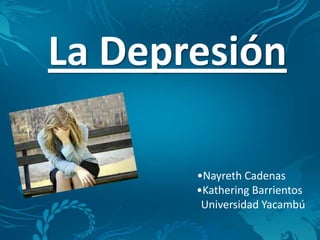La depresión es un estado de ánimo triste, ansioso o vacío persistente que causa pérdida de interés, energía y placer. Puede ser causada por factores genéticos, físicos o situacionales como enfermedades, pérdidas o estrés. Existen varios tipos como la depresión severa, distimia y trastorno bipolar, que se diferencian en gravedad y duración de síntomas como cambios de apetito, sueño y pensamientos negativos. El diagnóstico y tratamiento adecuados requ