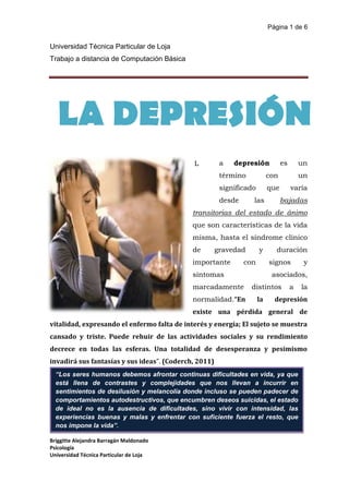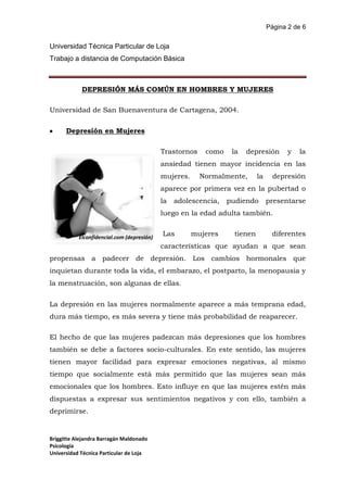 El documento discute la depresión en hombres y mujeres. Señala que la depresión es más común en mujeres debido a factores hormonales y socio-culturales. Sin embargo, los hombres tienden a ocultar su depresión y expresarla de manera diferente, como el abuso de sustancias o el aislamiento. Aunque la depresión es menos frecuente en hombres, ellos tienen más probabilidad de cometer suicidio cuando están deprimidos.