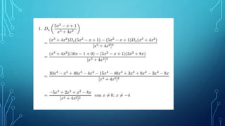 Este documento trata sobre el tema de la derivada en Análisis Matemático 1. Explica conceptos clave como la derivada de una función en un punto y su interpretación geométrica como la pendiente de la recta tangente. También cubre reglas para derivar funciones como sumas, productos y cocientes, así como derivadas de funciones exponenciales, logarítmicas y trigonométricas. Finalmente, introduce conceptos avanzados como derivadas parciales y derivadas de orden superior.