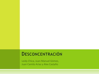 La desconcentración administrativa consiste en distribuir funciones de una entidad u organismo a diferentes áreas funcionales o unidades territoriales para garantizar la eficiente prestación de servicios y cumplimiento de funciones. Se diferencia de la delegación y la descentralización en que no implica la transferencia de la persona jurídica y mantiene una jerarquía y dependencia entre la autoridad concentrada y las autoridades desconcentradas.